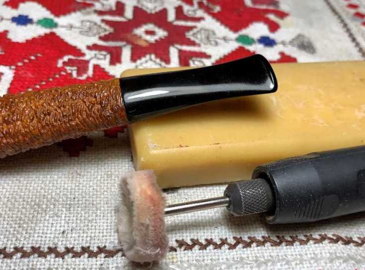 Changing buffing wheels for one dedicated to applying wax, carnauba wax is next applied to the stem and to the smooth briar nomenclature panel on the heel of the stummel. After the application of wax, the stem is given a rigorous hand buffing with a microfiber cloth to raise the shine and to remove excess wax.