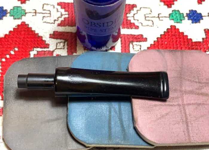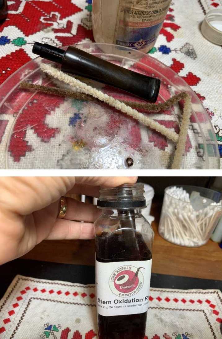 After cleaning the airway with pipe cleaners moistened with isopropyl 99%, the stem is placed in a soak of Briarville’s Stem Oxidation Remover. The stem will soak through the night to address the oxidation.
