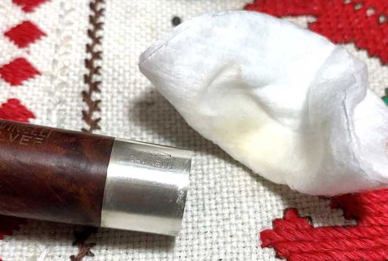 Before progressing further with the stummel, the band needs to be cleaned carefully with a tarnish remover. Using a cotton pad, a small amount of the fluid is applied to the band careful to avoid getting the fluid on the briar – I don’t want to risk discoloration. A product called Tarn-X is used and it does a good job. The results are good! The band should bling up a bit more when polished with compound.