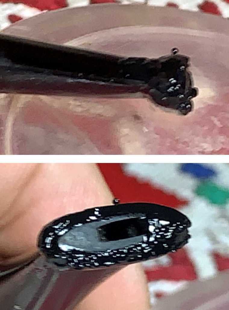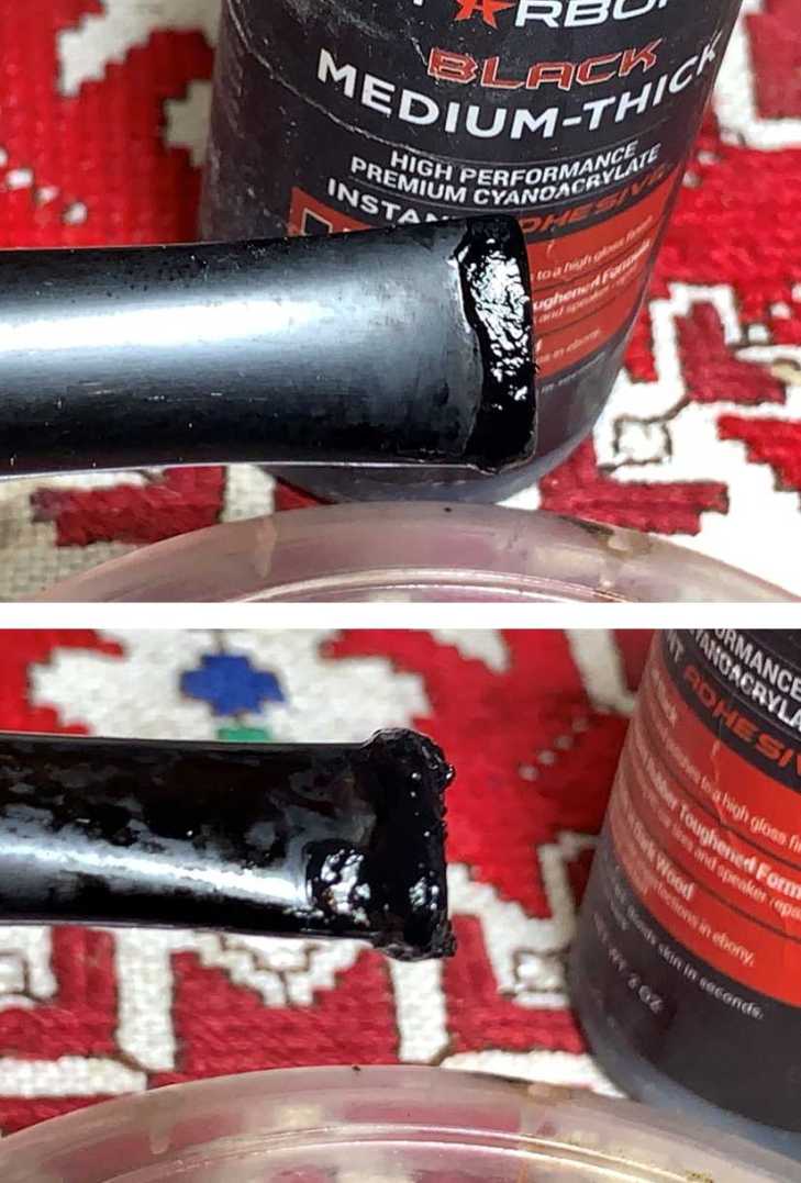 To remedy this the button needs to be built up. Medium-Thick Black CA glue is used to do the job. The approach is to place a layer of Black CA over the button one layer at a time – upper, then lower. After each layer of CA is placed on the button, it is sprayed with an accelerator that immediately cures the glue keeping it in place. Each layer is applied in the same way.