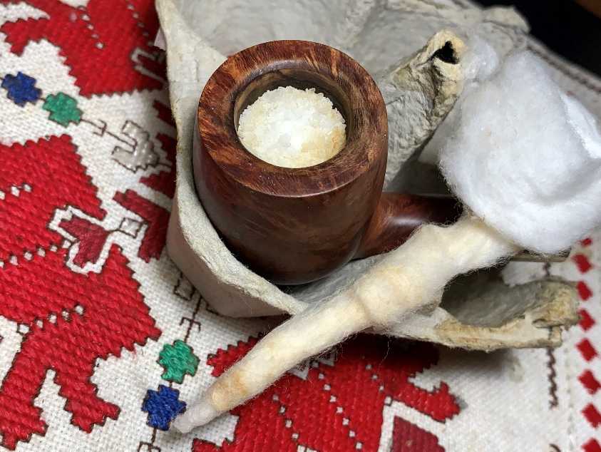 The next morning the stummel has soaked through the night. The cotton wick and kosher salt show the yellowing that indicates further tars and oils were extracted from the internal briar.