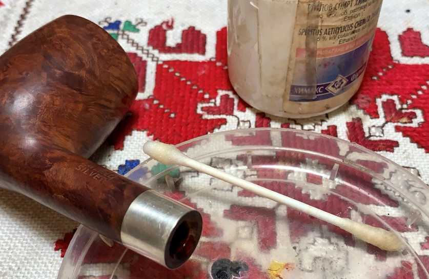 The cleaning of the internals continues using cotton buds and pipe cleaners with isopropyl 99% alcohol. A small dental spoon also helps the cleaning by scraping the internal walls removing tars and oils. When the buds start coming out lighter, the job is called to be continued later with an alcohol and kosher salt soak to help draw out more tars and oils from the briar and to freshen the briar.