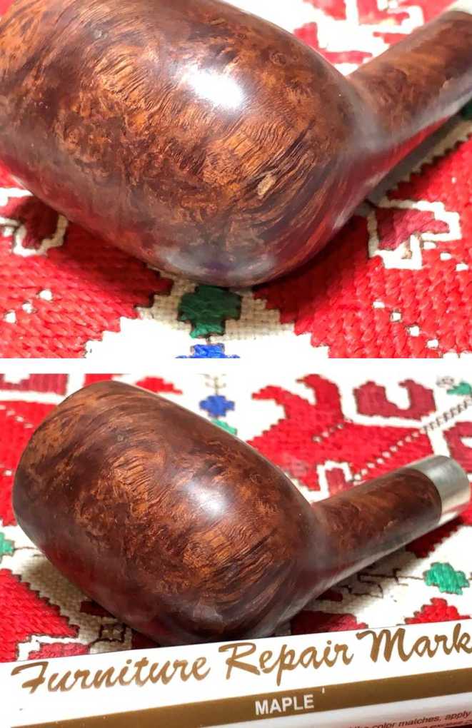 Turning now to the external briar surface, a single fill on the front of the heel is lighter and stands out. Applying a maple dye stick does the job of masking the fill.