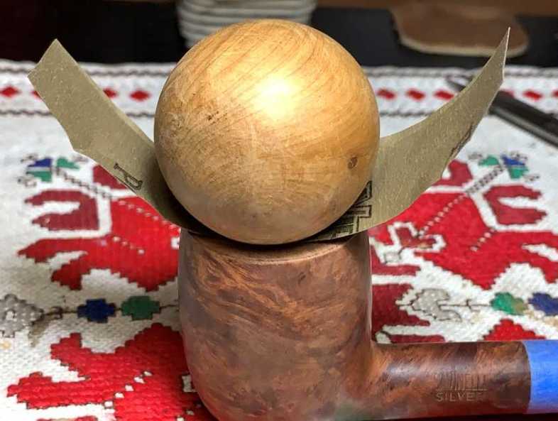To refresh the bevel, a wooden sphere is used which rests in the circle of the chamber mouth. A strip of 600 grade paper is pressed by the sphere against the beveled edge and rotated several times.