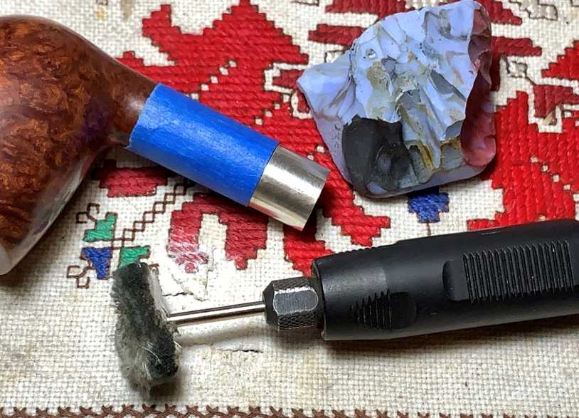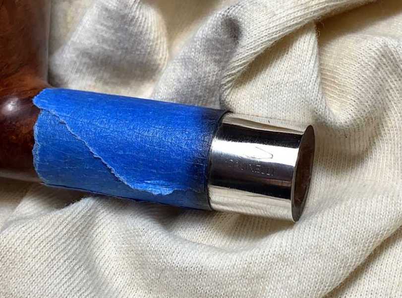 Next, the painter’s tape is reversed to protect the shank briar from applying Blue Diamond compound to the sterling silver band. A dedicated cotton cloth buffing wheel is always used when applying compound to metal. As you can see on the wheel and the dedicated area on the block of Blue Diamond, the polishing of metal gives off a black residue. I’ve learned the hard way that this black residue can very easily stain nearby briar.