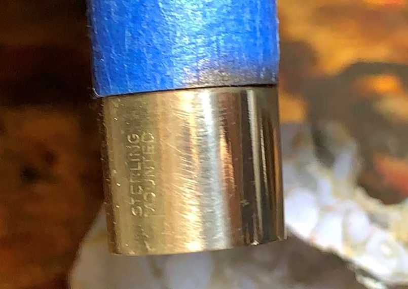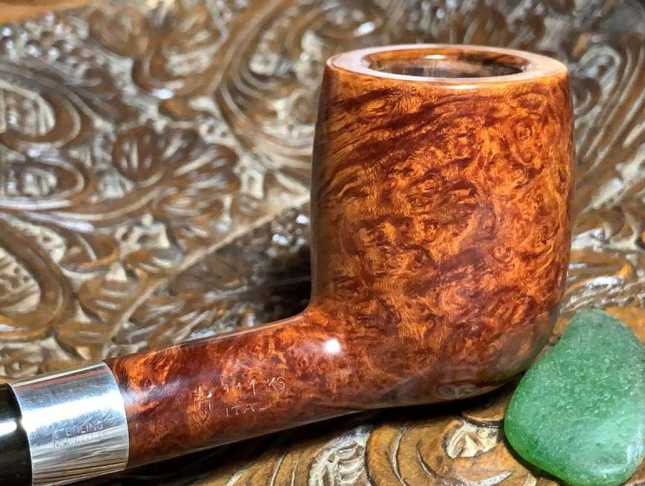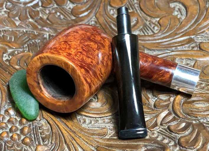 The ‘Silver’ designation for this line of Savinelli pipes is for the band which has the sterling silver grade of .925 inside a flattened quadrangle [over] SAVINELLI. On the opposite side of the band is stamped, STERLING [over] MOUNTED. The band needs some attention to spruce up the bling of this classic Billiard.