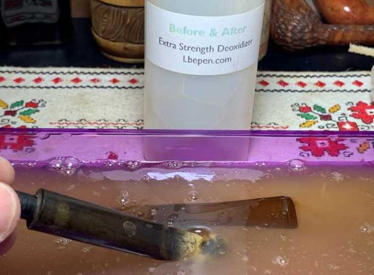 To address the oxidation and calcification on the bit, Mark Hoover’s Before & After Extra Strength Deoxidizer is used. The stem is placed in the soak for several hours.