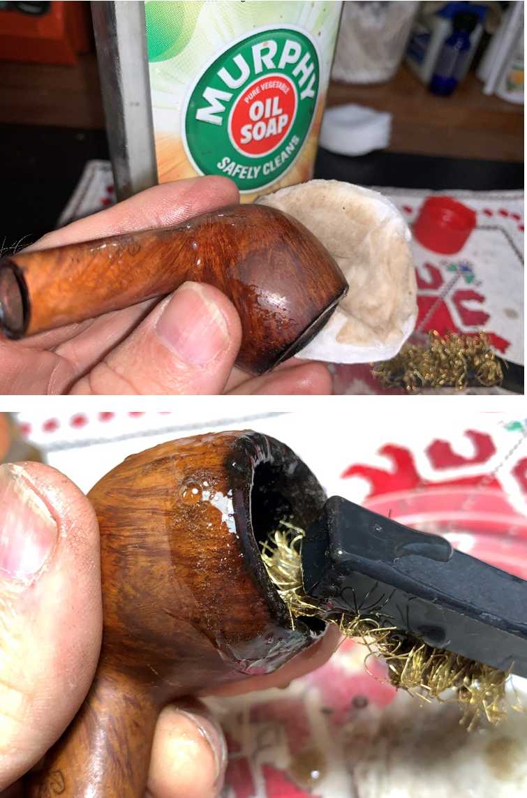 The cleaning next focuses on the external briar using Murphy’s Oil Soap with a cotton pad. The brass wire brush is also used to work on clearing the charring from the rim.