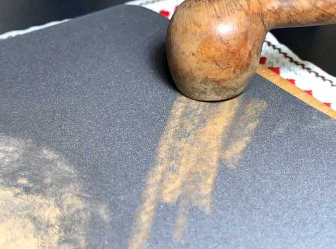 The application of the compound creates a lot of fine dust which needs to be removed before application of wax. The pipe is buffed with a felt cloth to do this as well as to remove any clumping compound still adhering to the briar surface.