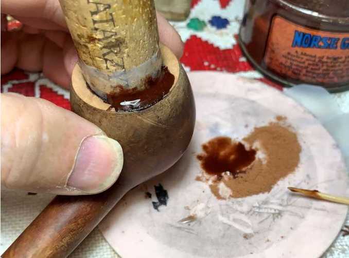 Briar putty is made by gradually pulling the briar dust into the CA with a toothpick and mixing it. As more dust is added to the mixture, it gradually thickens. When the putty gets to the viscosity of molasses, where it’s thick enough not to easily run, but thin enough to fill the mold – it’s then ready to go. The toothpick trowels the putty and fills the mold. The toothpick is also used to knead the briar putty to settle it fully into the gap as well as to release air pockets that may be trapped. I’m not concerned about overflowing onto the top of the rim. This will be sanded off later.