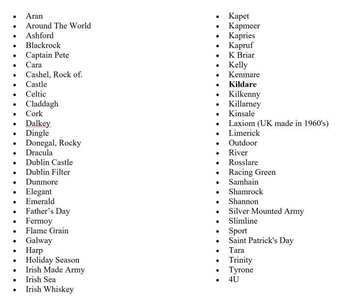 Kildare 1965 – First issue of line with matt finish smooth pipe in the Classic Range, P-Lip and fishtail. Second issue c. 1979 as Kildare Patch, with rusticated patches on pipe surface. Third issue 2010, brown matt, P-Lip or fishtail, no band. Fourth issue 2011–, burgundy sandblast, nickel army mount, fishtail, exclusive to Smokingpipes.com. See Etched.