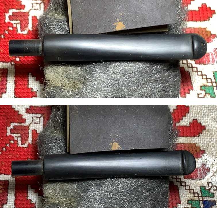 In the picture above, the patch area is hard cured briar putty. The result of this is that the edge is sharp. To soften the inner rim edge appearance and to continue to improve the roundness, a strip of 220 paper is wrapped around a wooden sphere and with the sphere pressed into the chamber mouth, the sphere is rotated to sand a smart bevel.