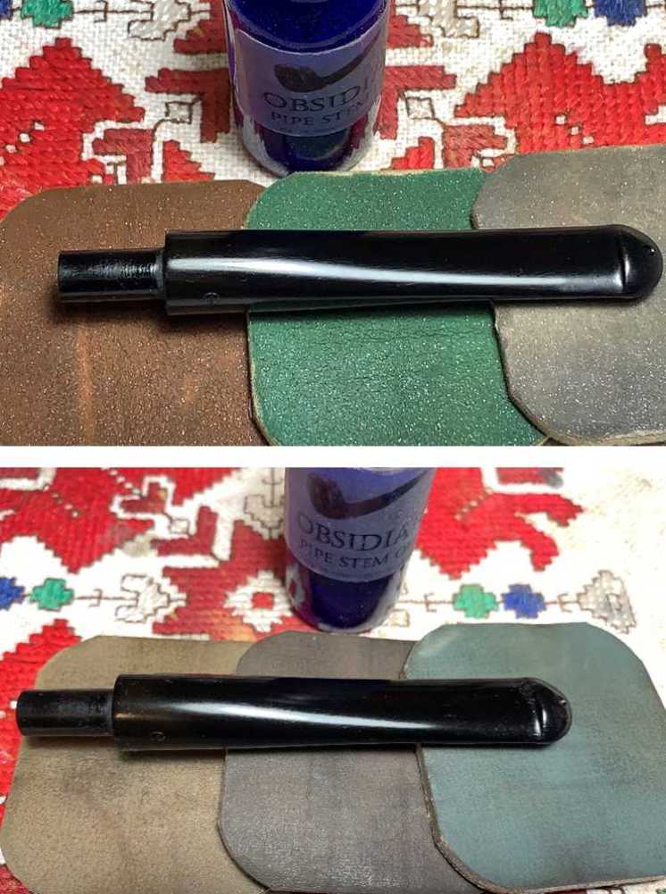 The stem is now ready for the micromesh sanding/polishing by starting with wet sanding with pads 1500 to 2400. This is followed by dry sanding with pads 3200 to 4000 and 6000 to 12000. Between each set of 3 pads, Obsidian Oil is applied to condition the vulcanite and to protect the stem from oxidation.