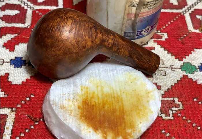 The internal cleaning continues using pipe cleaners and cotton buds moistened with isopropyl 99% alcohol. A small dental spoon also helps to scrape tars and oils off the mortise walls. After a time, the buds and cleaners start emerging lighter. I call the cleaning to a halt. Moving on.