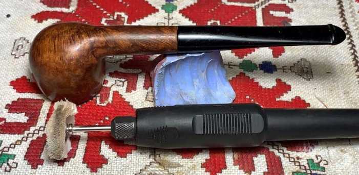 With the speed the same, another cotton cloth wheel is mounted, and Blue Diamond compound is applied to the reunited stem and stummel.