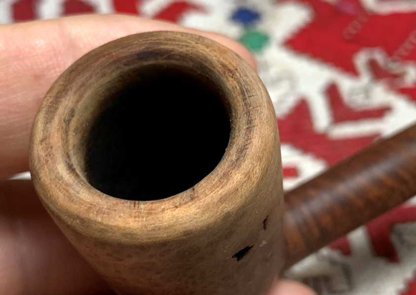 Ah!  This pipe I called a Chimney shape.  It could be described as a Dublin shape as well I suppose.  It is a streamlined, lightweight pipe.  To me, it’s a cool pipe.  Savinelli is a well-known Italian pipe house that has put out nice pipes for a long time.  The challenge of this pipe is that the briar grain has several pits that will need repairing.  The grain has a very distinctive bird’s eye grain which is nice and will come out nicely.