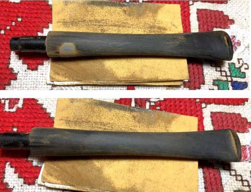 To begin the restoration of this unique Savinelli Slim Dublin, the stem airway is cleaned with a few pipe cleaners moistened with isopropyl 99% alcohol.To address the oxidation in the stem, the stem is placed in a soak of Briarville’s Stem Oxidation Remover.After several hours soaking in the Oxidation Remover, the stem is fished out.  The picture shows the raised oxidation in the vulcanite rubber stem as a result of the soak.Initially, a cotton cloth is used to vigorously rub the stem to remove the raised oxidation.  This is followed by applying a 0000 grade steel wool.The stem looks good.  To help to condition the stem, Paraffin, a mineral oil, is applied to the stem.  The stem is then set aside to soak in the oil.Turning next to the bowl, the chamber is reamed to clear away the carbon cake that has built up.  I discovered quickly that the narrow Dublin chamber is shaped conically and is too narrow for the regular reaming process tools.Passing on the Pipnet Reaming Kit, the Savinelli Fitsall Tool is used to scrape the narrow chamber and is able to reach down to the floor and get to the hard-to-reach places.The Savinelli Tool is followed by sanding the chamber with 220 paper wrapped around a Sharpie Pen for leverage.  This clears the last vestiges of carbon cake build up and smooths the chamber.After the cleaning of the chamber, an inspection of the chamber finds healthy briar.  Moving on.With the chamber cleaned, the external briar is next addressed.  The bowl is darkened with grime and age.  A few of the fills are visible in the picture below – the lower one has old patch material still in it.  We’ll see if the cleaning dislodges the fill.  A few starting pictures are taken to show the rim and bowl and mark the progress.Using undiluted Murphy’s Oil Soap, the rim and bowl are scrubbed using a cotton pad.  A brass brush is also used to clean the lava flow from the rim.The bowl is next taken to the sink where the internals are cleaned.  Using hottish water and anti-oil liquid dish washing soap, shank brushes scrub the mortise.  After the scrubbing, the bowl is thoroughly rinsed and returned to the worktable.The internal cleaning is continued using isopropyl 99% alcohol with cotton buds and pipe cleaners.  After some effort, the cleaners and buds emerge lighter, and the cleaning is called.After the cleaning, a survey of the stummel shows the issues.  The rim cleaned up nicely.The following pictures show the numerous fills that need addressing.  With the stummel now cleaned, these pictures show why Savinelli decided to patch the pits.  The grain shows great potential. There’s a lot of bird’s eye grain populating the briar – as you would expect, opposite to the bird’s eye are the straighter grain patterns.  This Slim Dublin shows great potential.The next order of business is to clean the old fills.  A sharp dental probe is used to do the job.  A series of photos are taken to show the excavation progress. To patch the numerous pits, briar putty will be applied to fill the pits.  After cleaning off the stummel with alcohol, a small puddle of clear CA glue is placed next to a small mound of briar dust.  The toothpick is used to pull dust into the glue and then mixed to form the putty.  More briar dust is pulled gradually into the glue and when it reaches the thickness of molasses, it’s thick enough.The toothpick trowels a small amount to fill each pit. After all, 14 (I think) pits were filled, the stummel was put to the side to allow the putty to thoroughly cure.Turning now to the stem, I detected only two compressions on the lower bit side.  One is very visible and the other is just to the right and below the pronounced compression in the picture below.  To erase or minimize the compression, the heating method is used.  Using a Bic lighter, the bit is painted with the flame.  As the vulcanite heats, physics takes over and the rubber expands to reclaim its original position, or closer to it.  The ‘before and after’ pictures show that the compressions were minimized and sanding will easily finish the job.The thinning Savinelli stem stamp is covered with painters’ tape and the entire stem is sanded with 470 paper.The 470 paper is followed by 600 grade paper and then 0000 grade steel wool is applied.Continuing the sanding and polishing process, 9 micromesh pads are applied starting first with pads 1500 to 2400.  This is followed by pads 3200 to 4000 and 6000 to 12000.  Between each set of 3 pads, Obsidian Oil is applied which helps to condition the stem and to protect the stem from oxidation.  During the last set of 3 pads, the protective tape was removed.  At this point the pads are not abrasive but polishing and this helps to blend the area around the stem logo. The 14 patches have fully cured.  The flat and square needle files go to work bringing each patch mound flush with the briar surface.  As much as possible, the filing stays on top of the mounds to avoid collateral impact on the surrounding briar.After the filing, 240 sanding paper next makes the rounds to further smooth the patch areas and to remove the filing marks.While I have the 240 paper in hand, the rim is sanded and given a softer, rounded bevel.Next, to further smooth the patch areas, 600 grade paper is used.  One patch is pictured as an example of all.With the myriad of scratches on the stummel and the patched areas, sanding sponges are used to clean the briar.  Starting with coarser sponges and working to lighter sponges, the stummel is sanded.  Even though the nomenclature on both sides of the shank is almost impossible to see, protective painters’ tape is placed where stamping should be.Continuing with the sanding and moving into polishing, micromesh pads are used.  Starting with pads 1500 to 2400 the stummel is sanded.  This is followed by pads 3200 to 4000 and 6000 to 12000.  Between each pad, the bowl is wiped with a damp cotton cloth to clear the dust and 