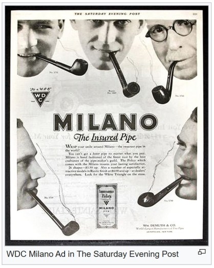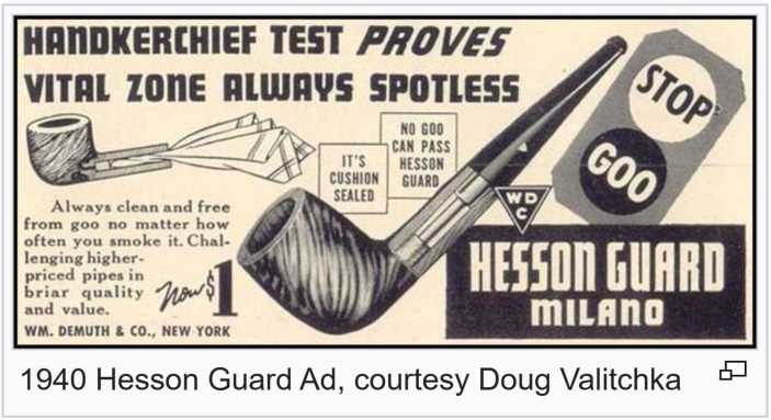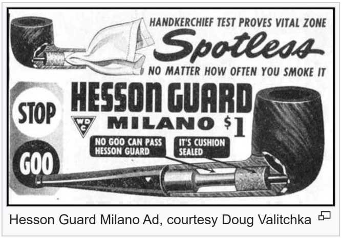 I’m familiar with the WDC Milano Hesson Guard series which is known for the patented air-cooling system created by William Wallace Hesson.  The system is designed with internal metal fitments which, according to the ads below, reduce moisture, goo, and moves the pipe smoking world closer to the holy grail 😊. The Hesson system had two patents according to the Pipedia article, December 22, 1925, and in 1932.  The picture below is my Milano Hesson Guard gifted to me by a professor when I was at Reformed Theological Seminary many years ago.  I believe the design looks like the 1925 version of Hesson patents.The patenting of WDC Milano pipes is also relevant to the research regarding the Milano DeResino Processed on the worktable now.  Mining out information about this particular brand hasn’t been easy, but in a general search with the Milano DeResino parameters, I came upon a partially defunct page on the Tapatalk Kaywoodie site called ‘W.D.C. Master List’.  It contains a long list of W.D.C. Models and at one time, each model had pictures associated with each, but now the picture links are not working.  Scrolling down the list hoping to find information about the DeResino Processed name, this is what I found: