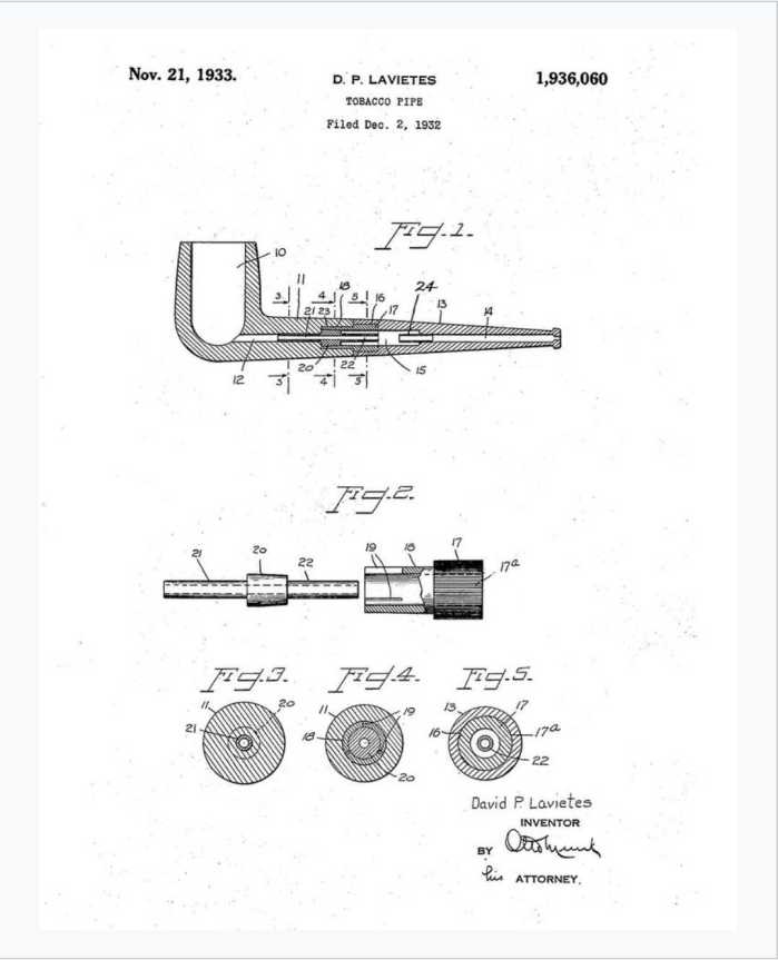 This patent information took me back to the Milano patents listed in the Pipedia article.  Along with the examples of the two Hesson patents was an additional 1933 patent attributed to a ‘D. P. Lavietes’ – specifically: Nov.21, 1933 patent, filed Dec. 2, 1932.   I didn’t pay too much attention to this patent because I was looking for words, ‘DeResino Processed’, but saw none.  However, the patent number listed above from the W.D.C. Master List, 1936060, was the finger print that connects this patent to the Milano DeResino Processed on the work table.  Here are the patent pages from the Pipedia article (Courtesy of Doug Valitchka). I took the time to thoroughly plow through the text of the patent.  After reading it, to summarize, the essential goal of the patent is stated as,