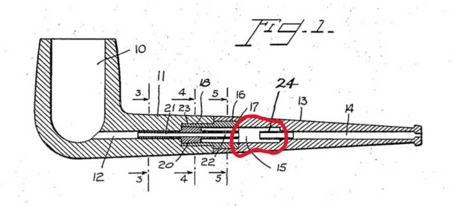 The key factor in achieving these aims is the fashioning of a ‘well’ that traps all the gunk (#15):In the reading of the patent text, I found no reference to ‘DeResino Processed’.  The only reference tying this patent to the Milano ‘DeResino Processed’ is from the W.D.C. Master List cited above.  However, I found one more bit of information that could be considered anecdotal.  Continuing to search for ‘WDC Milano De Resino’ a few hits came from pipes fitting the description being sold on different platforms.  Of special interest with more street cred than most ‘for sale’ descriptions came from SmokingPipes.com.  For sale was a WDC Milano De Resino Processed (48) and the description was written by Bear Graves with the accompanying photo: