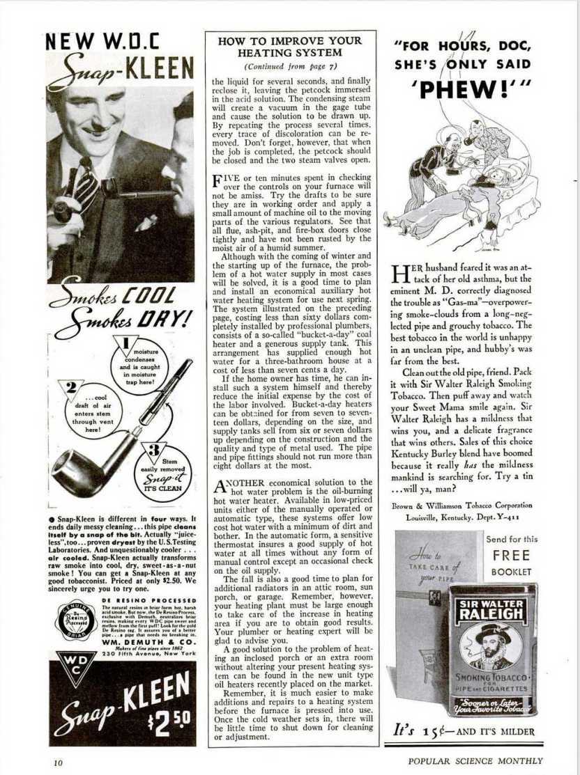 The link was a 2012 discussion on the De Resino from CigarForums of all places, where a thread was labeled: “New guy question about a pipe I have”.  He had bought the pipe and could not make out the meaning of De Resino….   A few fellow cigar men responded to the query pointing to De Resino Processed as referring to a briar treatment like oil curing or something similar and remarking that the pipe probably had some age.  Then, ‘Indigosmoke’ chimed in with a link pointing to a 1934 ad in a Popular Science Magazine (LINK). I loved looking at this magazine snapshot frozen in time – not only the science that was new and groundbreaking then, but the ads were great.  The ads harkened back to a time when pipe smoking and tobacco use were a normal and casual part of life.  The page which was relevant to the Milano unlocked the mystery.  The WDC ad was on the left side of the page, but my eyes were also drawn to the comical ad for Sir Walter Raleigh.  Apparently, using SWR in one’s bowl improved the health of one’s wife….The WDC ad was promoting the Snap-Kleen pipe, but in small print on the lower side of the ad was the promotion and explanation of the De Resino Processed.  I clipped the promo from the page above complete with the ‘Gold De Resino Tag’.  The process neutralizes the briar resins so that the briar is sweeter and needs no breaking in.  Mystery solved.The Milano De Resino Processed on the table most likely dates as suggested by Bear Graves of SmokingPipes.com from the 30s to the 50s.  It has been linked to the D. P. Lavietes patent #1926060 of November 21, 1933.  To confirm this patent design, I can take a look at the internal fitments once I get the stem off the stummel.