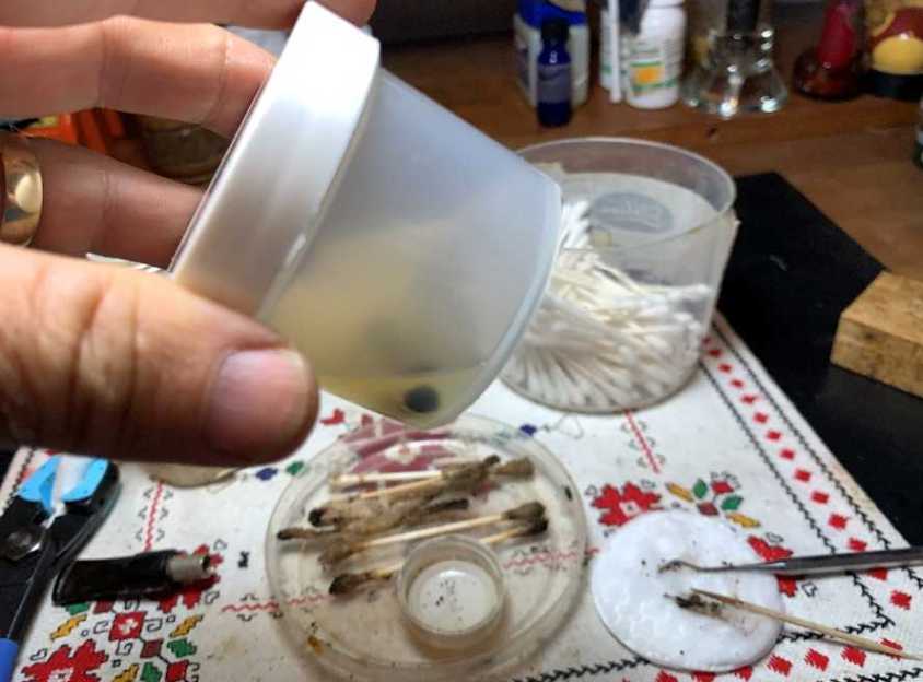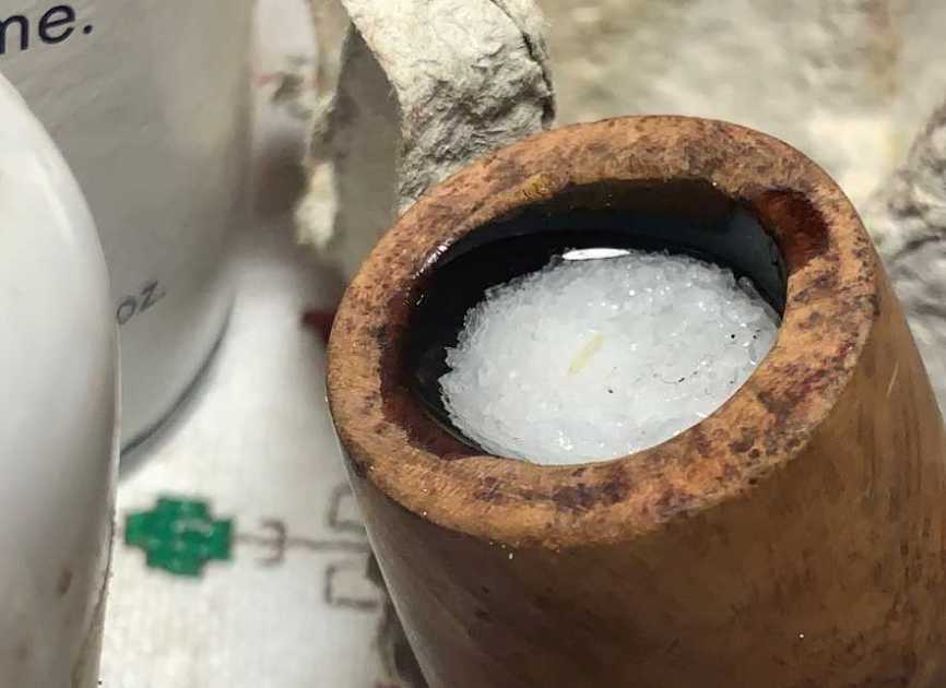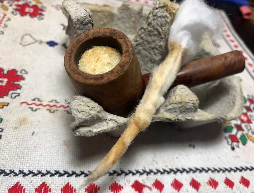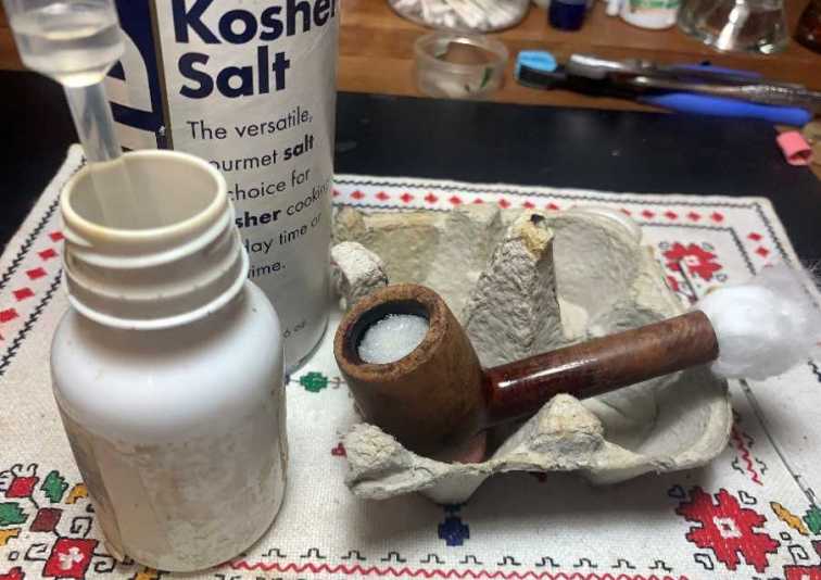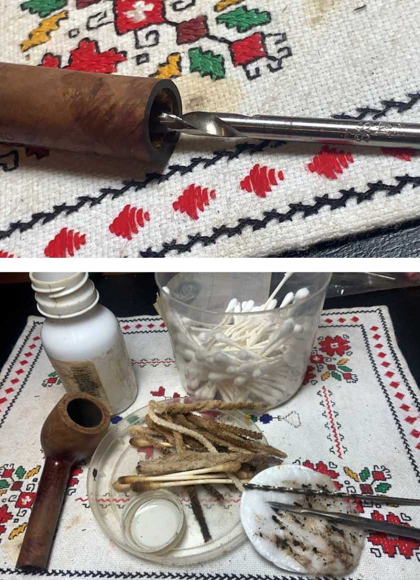 This leads to taking a closer look at the Milano now on the table.  I have not been able to remove the stem – it is rock solid stuck, and every time I try to twist the short saddle stem, I brace myself for the unmistakable sound of a ‘snap’ indicating a cracked shank.  This I do not need.  The bowl has thick carbon build up which needs cleaning to examine the briar beneath.The rim is also worn with cuts and nicks on the edges, both externally and internally. The finish is all but gone and vestiges of the old finish can be seen.On the left side of the bowl there appears to be a significant cut into the briar.As one would expect, there are scrapes and dings over the surface of the stummel.The stem has minor oxidation with some bite compressions on the upper side. To begin the restoration of this WDC Milano, the stem needs to be dislodged from the shank without cracking the shank.  I have tried twisting and turning, but with no success.  The next method that has worked in such cases is to put the pipe in the freezer allowing the cooling of the materials to contract.  If the fitments are metal as we’re assuming with the patented system, then what is stuck is the metal tubing which I believe should have a metal sleeve down the mortise.  The pipe goes into the freezer and the next day another attempt is made.  I first tried to hand twist the saddle stem, but still, it would not budge.  Next, using a soft grip pair of pliers with a cotton pad to add more padding, the plyers grip the bit of the stem.  With a gentle twist, the stem breaks loose and for the first time I can see the fitment.  Success with no cracked shank.Hmmm, I’m not sure what I was expecting basing my expectations on the patent drawings, but here it is.The sleeve I believed would be metal in the mortise appears to be a cork lining – care needs to be taken to preserve this.  There is an air-hole at the end of the tenon tubing. By looking at the ribbed end, I’m thinking that the very end of the tube in the picture below should be unscrewed.  I’m also thinking that the soiled cylinder in the picture below comes out of the larger metal tenon tube.  However, neither assumed junction would budge with the use of regular and soft grip pliers.  Heating is also used using a Bic lighter to heat the nickel.  This did not work either.The decision is made to give the stem an alcohol soak to see if this might soften the junctions. While the stem is soaking, the stummel is waiting.  To begin, the starting picture shows the thick carbon cake. The Pipnet Reaming Kit is used with two blade heads clearing away the thick cake.  This is followed by scraping the chamber walls further using the Savinelli Fitsall Tool and then sanding with 220 grade paper wrapped around a Sharpie Pen.An inspection of the chamber shows healthy briar – no heating problems detected.Moving next to cleaning the external briar, undiluted Murphy’s Oil Soap is used with a cotton pad to scrub the surface. There is somewhat of a ‘candy apple’ sheen from the old finish which I’m not crazy about.  We’ll see if the cleaning removes the old finish.The brass brush helps with cleaning the rim and a Winchester pocket knife carefully scrapes the stubborn lava crusting on the rim.The stummel is next taken to the sink using hot water and anti-oil liquid dish washing soap and employing shank brushes the internals are scrubbed.  I’m careful to avoid the cork lining at the mortise entry.  After the stummel is thoroughly rinsed it returns to the worktable.Cleaning on the internals continues using cotton buds and pipe cleaners moistened with isopropyl 99% alcohol.  Again, care is taken to avoid the cork lining.  The internals are in bad shape, and it took some doing to make some headway.  A drill bit the size of the airway was also used to help excavate the tars and oils from the airway surface.  A small dental spoon was used to scrape the mortise as well – again, avoiding the cork lining.The hour is late and to continue the internal cleaning, a kosher salt and alcohol soak will be used.  This slow cleaning method helps to draw tars and oils from the internal briar and to freshen the briar.  A cotton wick is formed by pulling and twisting a cotton ball.  The ‘wick’ helps to draw the tars and oils from the briar.The cotton wick is guided down the mortise and airway with the help of a stiff wire.  I managed to bring the wick all the way to the draught hole.Next, kosher salt is used to fill the bowl.  Kosher salt is used because it will not leave an aftertaste unlike regular iodized table salt.  With the stummel placed in an egg carton for stability, the rim and end of the shank are angled to be roughly level.  Isopropyl 99% alcohol then fills the chamber till it surfaces over the salt.After a few minutes, the alcohol is absorbed and again the alcohol is topped off.  The soak will continue through the night.The next morning, indicators of the cleaning processes happening through the night are the soiling of cotton wick and salt. To confirm the cleaning, a few cotton buds and pipe cleaners are used, and the internals are as clean as I’m able to make them!Looking now at the results of cleaning the stummel, most of the old finish is gone and what is hanging on is in stark contrast which almost looks like a wet spot on the briar.  The areas still holding on to the old finish are the shank and the crook.Using acetone with a cotton pad, the residual finish is removed from the stummel.  I’m surprised that the finish residue appears to be an Oxblood or reddish hue – hmmm.  I’ll need to think about this.  My thoughts up to this point have been simply to go with the natural briar hue which is what I thought I was looking at 😊.  Now that I see the reddish hue on the pad, looking at the pictures above, the finish is definitely bent in that direction, but the natural briar looks good.With all the cleaning, the cork lining in t