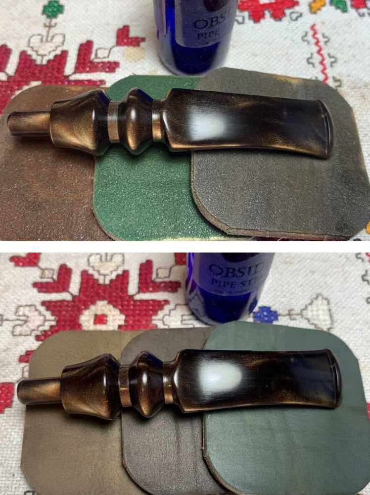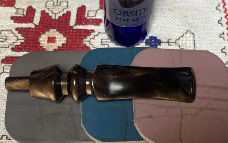 The sanding is expanded now to the entire stem using micromesh pads. With pads 1500 to 2400 the stem is wet sanded. Following the sanding of these 3 pads, Obsidian Oil is applied to condition the acrylic. After the first 3 pads, the sanding continues with pads 3200 to 4000 and 6000 to 12000. Between each of these pads, Obsidian Oil is applied to condition the stem and I believe it gives more traction to the following pads. The stem looks great after the micromesh process.