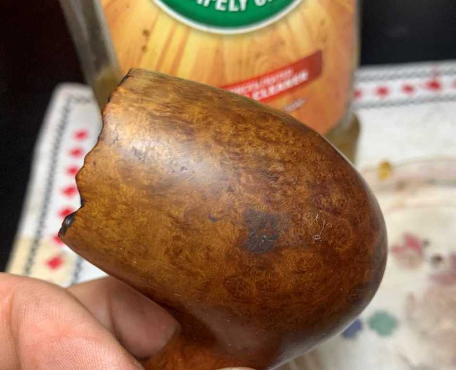 The external briar surface and plateaus are cleaned using undiluted Murphy’s Oil Soap and cotton pads. Both a bristled toothbrush and a brass wired brush are used to clean the rim plateau. The shank facing is also addressed.