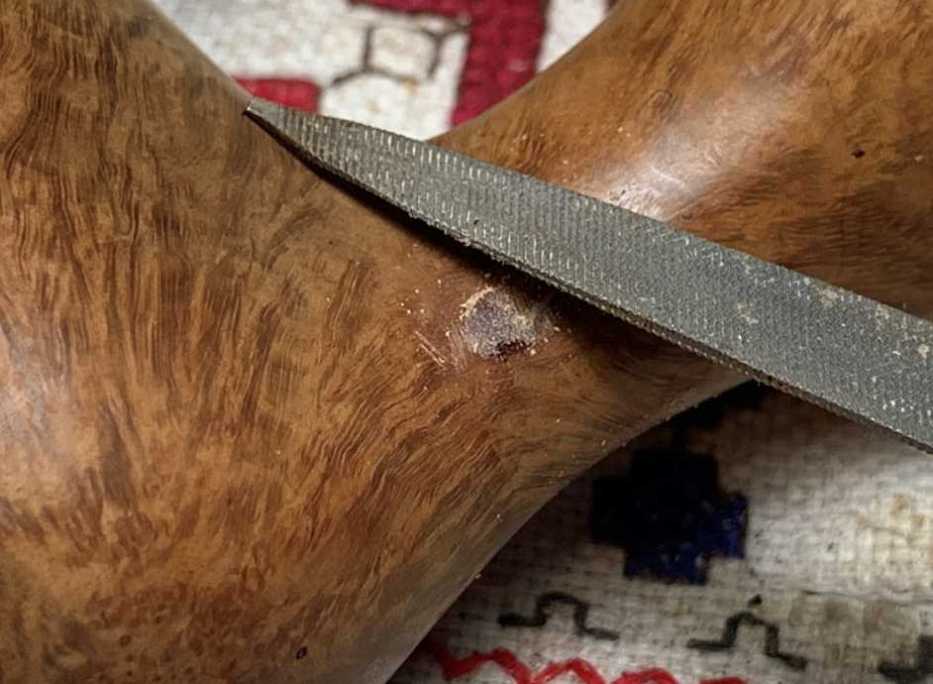 After the patch cures, a rounded needle file goes to work on filing the patch mound flush with the briar surface.