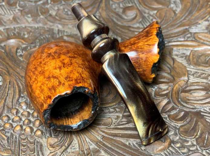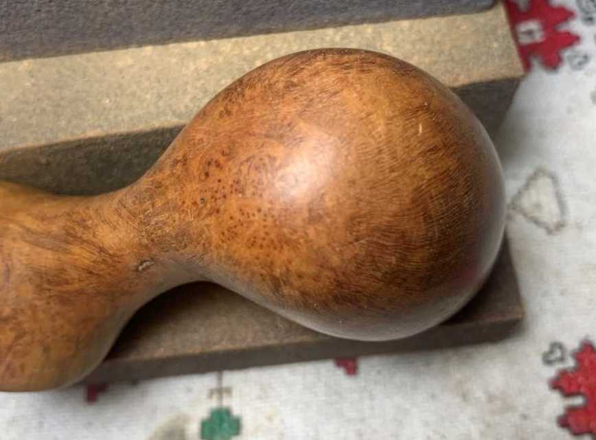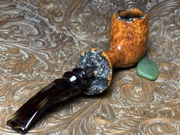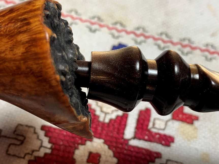 If one does not have a Freehand in one’s collection, it’s a good pipe to add! Freehands generally have larger bowls for longer times of fellowship and contemplation. The Freehand’s dimensions are Length: 6 5/16 inches, Height: 2 1/4 inches, Plateau width: 1 1/8 inches, Chamber width: 7/8 inches, Chamber depth: 1 5/8 inches. This Freehand has a brown and gold marbled acrylic stem which when refreshed, will have more pop. Bill Burney’s descriptions of pipe shapes is helpful (https://pipedia.org/wiki/Pipe_Shapes). This panel gives his description of what makes Freehands unique.