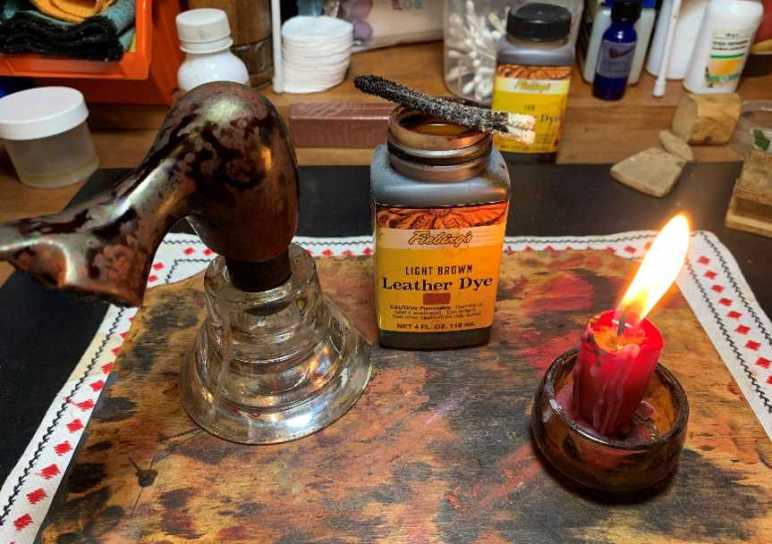 Using Fiebing’s Light Brown Leather Dye, a folded pipe cleaner paints the dye on a patch of the Freehand stummel and then the wet aniline dye is ignited with the candle to ‘flame’ it. The alcohol in the dye combusts and burns off leaving behind the pigmentation in the briar. This painting and flaming process is repeated until the entire stummel has been covered. The process then is repeated for a second round over the stummel to make sure the dye has been applied over the entire surface.