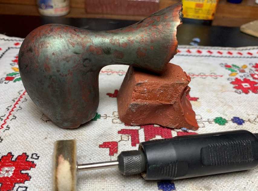 The reaming is done with the Pipnet Reaming Kit, but I discover that the floor of the chamber was deeper than the Pipnet blade heads could navigate without the reaming tool handle to collide with the plateau. Three blade heads reamed the chamber partially and then the Kleen Reem Pipe Tool was put into action. I found this old tool in a flea market in Kentucky on one of our trips east.