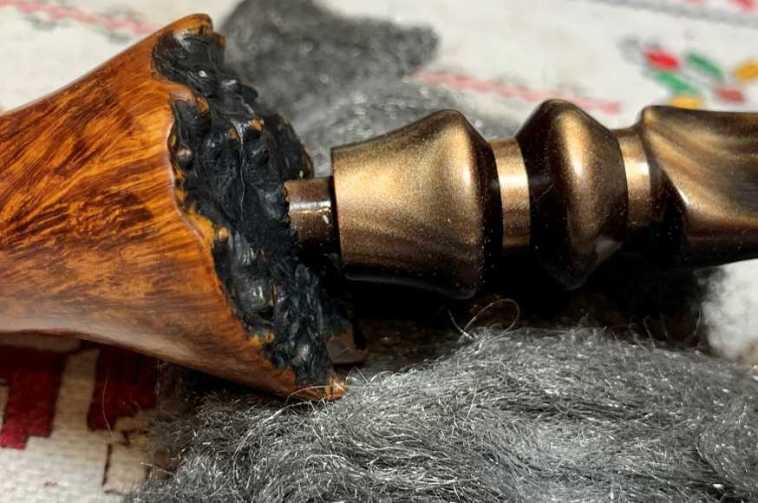 The next morning, it’s time to unwrap the crusted fired stummel. With a more abrasive felt buffing wheel mounted onto the rotary tool, the speed is set at about 40% full power. Brown Tripoli is then applied to the briar surface. Brown Tripoli is a more abrasive compound and with the combination of this and the felt wheel, the crusted wrapping is plowed off.