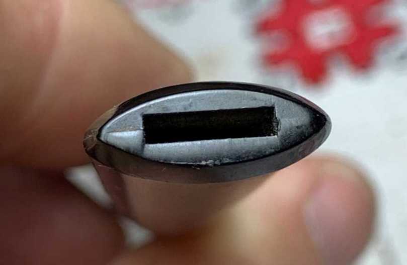 The button also has the dissection line running horizontally. The bit shows no tooth chatter, which is good news. I haven’t worked on too many plastic stems, so I’ll need to be careful not to be too aggressive and melt it.