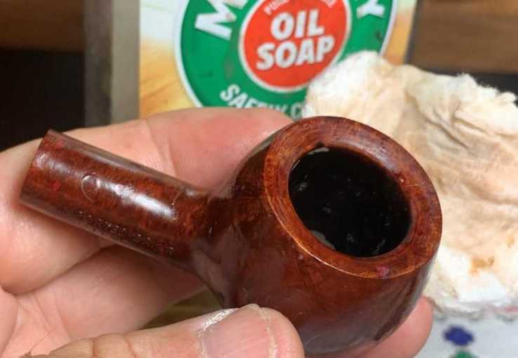 To clean, undiluted Murphy’s Oil Soap is used to scrub the external briar with a cotton pad.