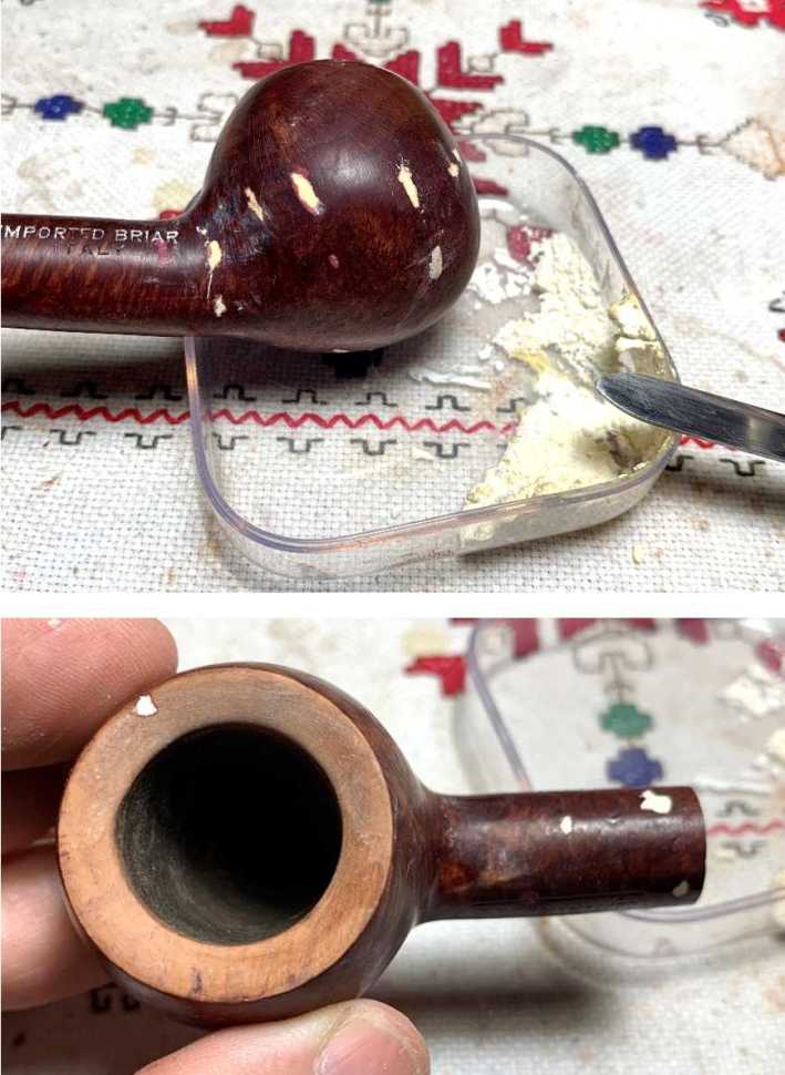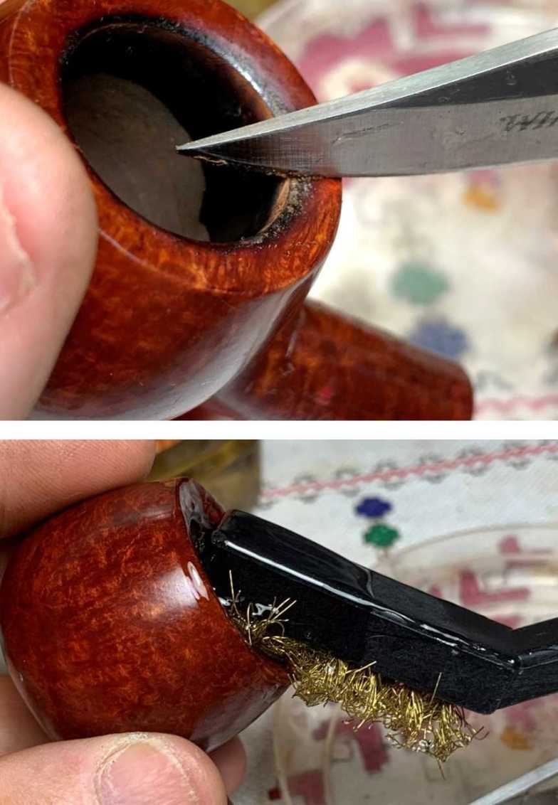 A knife helps scrape the crusted lava on the inner lip of the rim – carefully! Gouging the wood is not what I want to do. A brass wire brush helps as well. Brass is not invasive when used on the briar and adds some cleaning muscle.