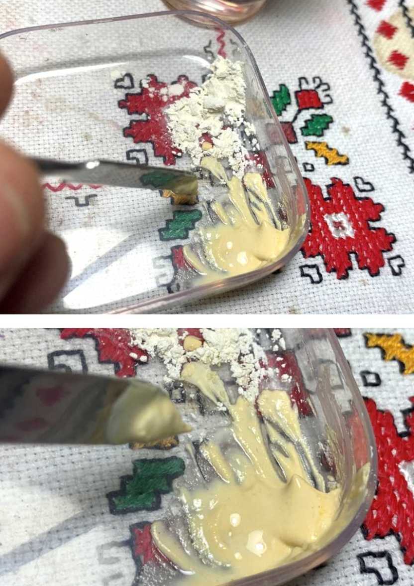 While adding and mixing, when the putty starts to thicken, about the consistency of molasses, a small amount is troweled to the pit that needs a fill.