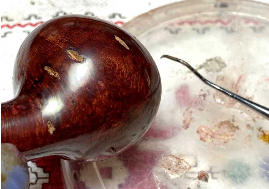 Honestly, I’m not believing what I am seeing. More fills and some not too small. At this point is when the name of this project took flight in my mind – “Pandora’s Pipe”. Why? Pandora’s Box was a beautiful attraction (probably a jar) with all the curses and evil omens which were released if one opened the box. To address the shiny, shellac, candy apple finish, would expose all the fills which would need to be examined and probably dug out and refilled AND refinished so that the new fills would be blended and not stand out (and there’s no way of knowing at this point if the pipe won’t be worse off after my ‘restoration’!) …. Pandora’s Pipe. I’ll need to give some thought to this. The pictures tell the story.
