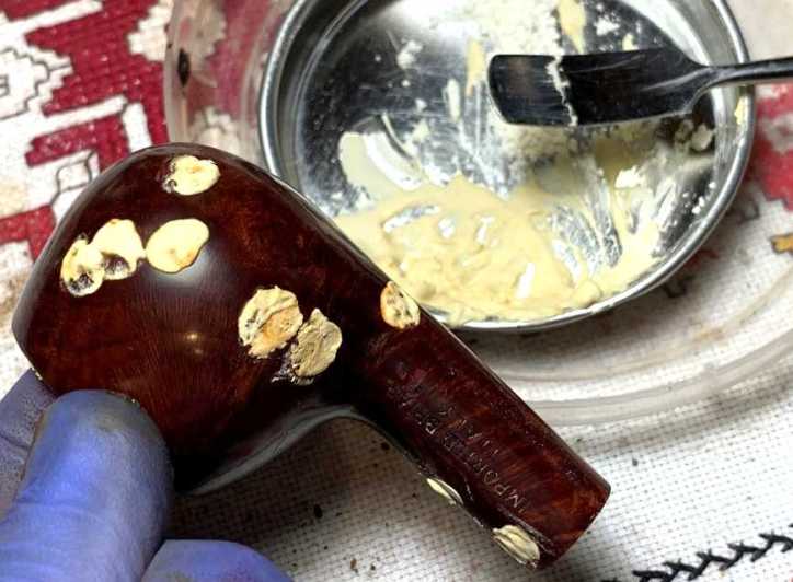 Again, the Water Putty is mixed and applied. What is different this time is that the stummel has already received the dye. I’ll address each patch individually without having to apply dye again to the entire stummel.