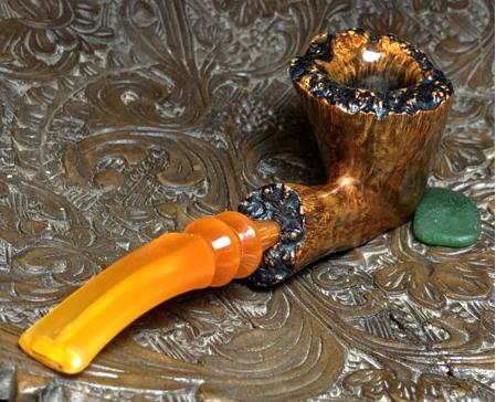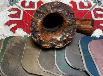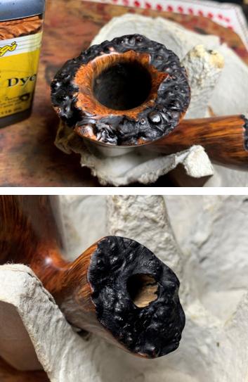 After the dye has set for a while, the peaks of the crags are sanded with micromesh pads 1500 to 3200 to reestablish the lighter contrasts of briar. This effect gives the briar a rustic feel. I like it.