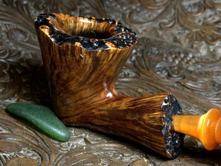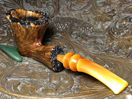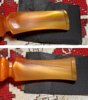 The ‘marmalade’ and honey marbled acrylic stem is striking. The shades of yellow, gold, tan… hold the eyes with no problem. The acrylic has tooth chatter pressed into the upper and lower bit which needs addressing.