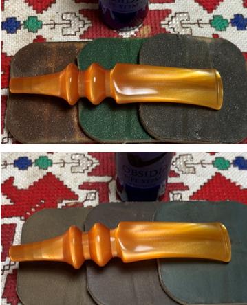 Next, the entire stem is sanded with micromesh pads beginning by wet sanding with pads 1500 to 2400. Following this, dry sanding is done with pads 3200 to 4000 and 6000 to 12000. To condition the acrylic Obsidian Oil is applied between each set of three pads. The acrylic finishes the cycles with that glossy, wet-looking pop. Very nice.