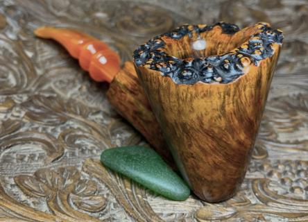 This Freehand lives up to the name inscribed on it – Nørdin Made in Denmark. The dimensions are Length: 6 5/16 inches, Height: 2 1/4 inches, Plateau width: 2 1/16 inches, Chamber width: 3/4 inches, Chamber depth: 2 inches. This translates into a lot of pipe in the palm. The grain is flowing and distinctive. Living up to the Danish mantra, ‘Follow the grain’ – the bowl captures vertically oriented grain and the shank was shaped along the horizonal grain lines. The surprise for me is the ‘flames’ of smooth briar circling the inner plateau providing an eye pleasing scape for the steward. They do remind one of flames licking up from the campfire. The acrylic stem’s luminescent honey/marmalade marbling sets off the entire presentation. Jocelyn commissioned this Nørdin for her husband, Mark, as a gift for the Christmas tree. She has the first opportunity to claim the Nørdin from the Pipe Store benefiting the Daughters of Bulgaria – helping women and girls who have been trafficked and sexually exploited. Thanks for joining me!
