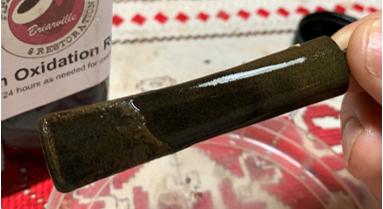 After the soak, the stem is removed and rigorously scrubbed with a cotton cloth to remove the raised oxidation.