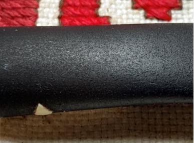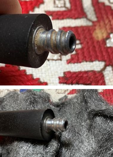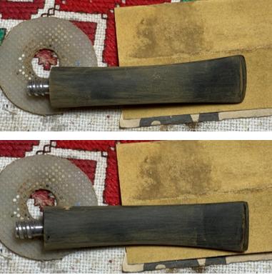 The stinger is remounted into the threaded tenon and buffed with a metal dedicated cotton cloth wheel. Buffing metals with compound produces black residue.
