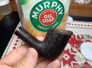 Moving next to cleaning the external briar, the picture above shows well the grime lodged in the wire rusticated rim. Undiluted Murphy’s Oil Soap begins the cleaning using cotton pads.