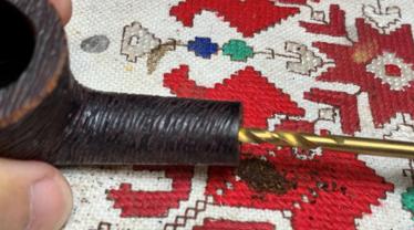 At this point, in my regular cleaning process, the stummel is taken to the sink where using hot water and liquid anti-oil dishwashing soap continues the cleaning process focusing on the internals. However, I was unable to run the shank brush through the mortise out the draft hole at the floor of the chamber. I attempted to blow through the mortise and there was an obstruction – the airway was plugged. Returning to the worktable after rinsing the stummel, I finally was able to push a straight sharp dental probe through the obstruction.