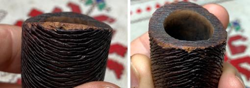 Before starting the stain process, I take another look at the edge of the rim that shows rough briar. The good news is that a rusticated surface is very forgiving because imperfections are more easily masked than with smooth briar. I think that will be the case here. The picture on the left shows the front of the rim. There is a sharper wood shard sticking out. I’ll sand that down a bit first. The right picture shows the rough briar on the back side as well. For both the back and front sides, simply applying the dye should be sufficient to remove the eye-catching blemishes.