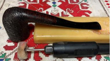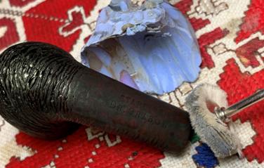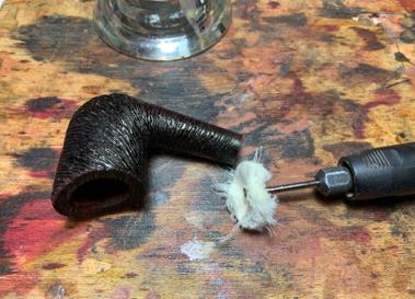 After reuniting stem and stummel, another cotton cloth wheel is mounted onto the rotary tool dedicated to applying wax. With the speed at about 40% full power, carnauba wax is applied to the pipe. After completing the wax, the pipe is giving a rigorous hand buffing with a microfiber cloth to remove excess wax and to raise the shine.