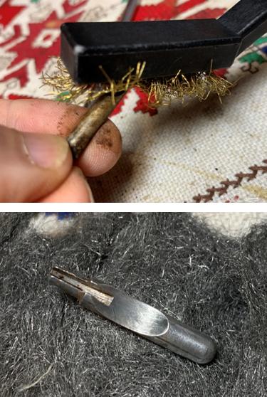 Both a bristled toothbrush and a brass wire brush join in. The toothbrush does a good job cleaning the grooves of the wire rustication. The brass brush helps to clean the thick lava buildup on the rim.